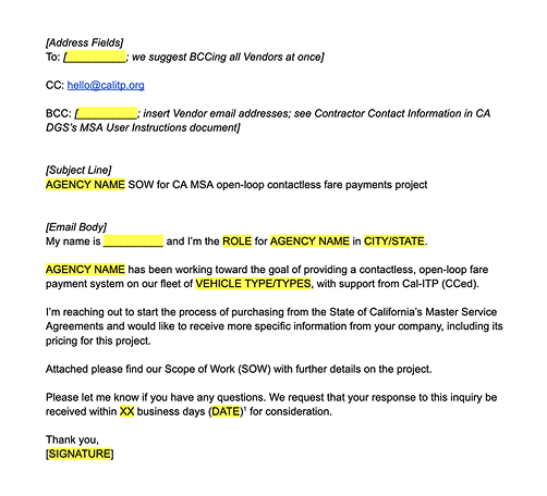 Send your SOW to vendors. We recommend sending the SOW to all MSA-awarded vendors using our email template. Their up-to-date contact information can be found in the MSA User Instructions document (vendor links: Connexionz Ltd, Passio Technologies LLC, Swiftly Inc)