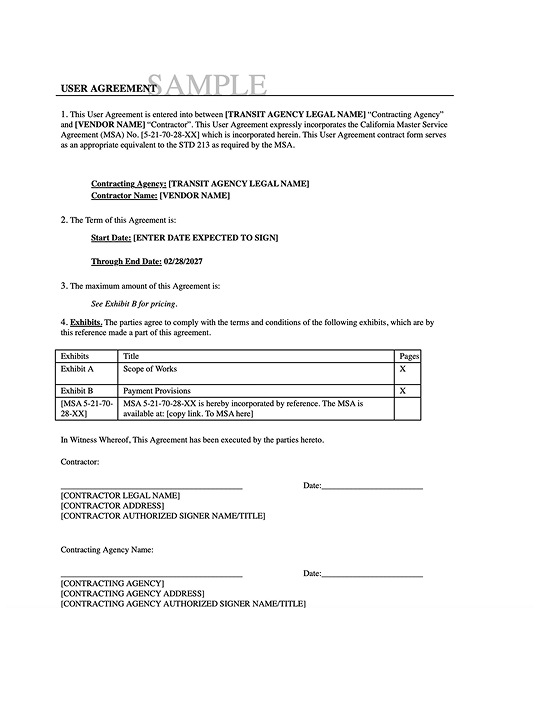 Once you’ve selected the winning proposal, you and the MSA vendor must execute a User Agreement including the SOW, agreed pricing, and referencing the MSA terms. You can use a Standard Agreement such as STD 213 for DGS or Sample User Agreement.